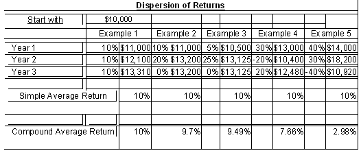 When the returns in a series of numbers become more dispersed from the average, the compound return declines. The greater the volatility of returns, the greater the drop in the compound return. Some examples will help to demonstrate this phenomenon. The table below shows five examples of how the dispersion of returns affects the compound rate.