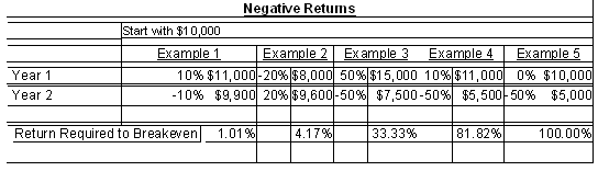 Another consequence of losses in the market is it takes a much greater return to recover to where you began. If you earn 10% in the first year and then lose 10% in the second year you still have a loss over the two years as the first example shows. Moreover, if you lose 50% in one year, you must generate a 100% return to just breakeven. A very difficult proposition.